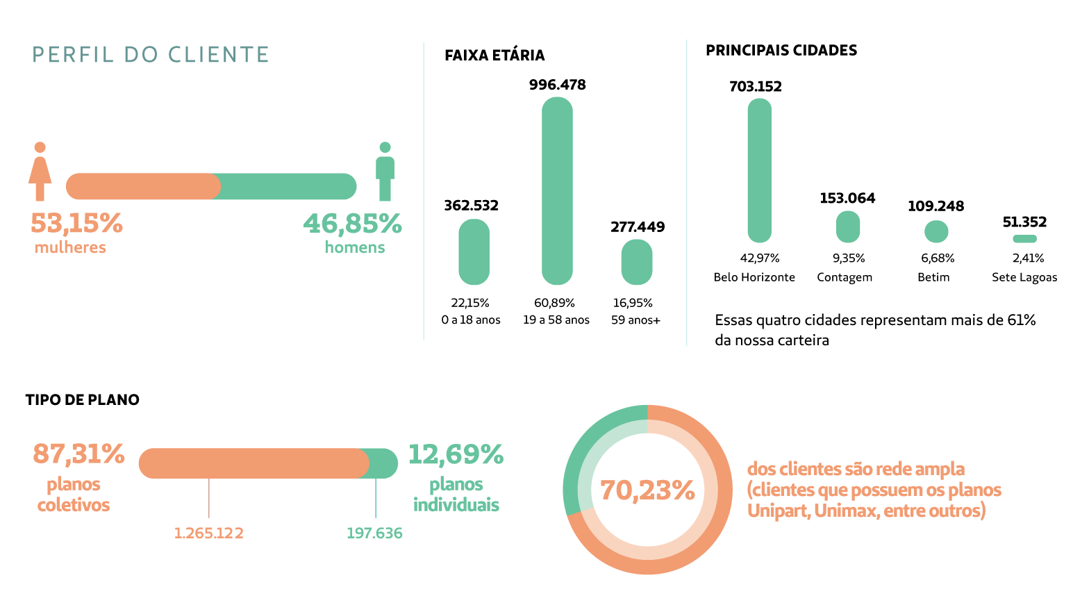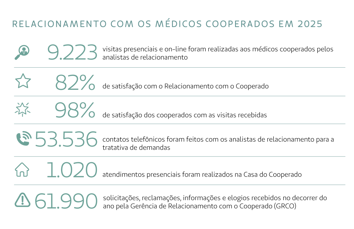 Cada tema apresentado neste relatório é consequência da escuta dos públicos de relacionamento e os resultados são frutos do empenho coletivo de médicos cooperados, colaboradores e parceiros, que compartilham conosco a missão de cuidar com excelência.