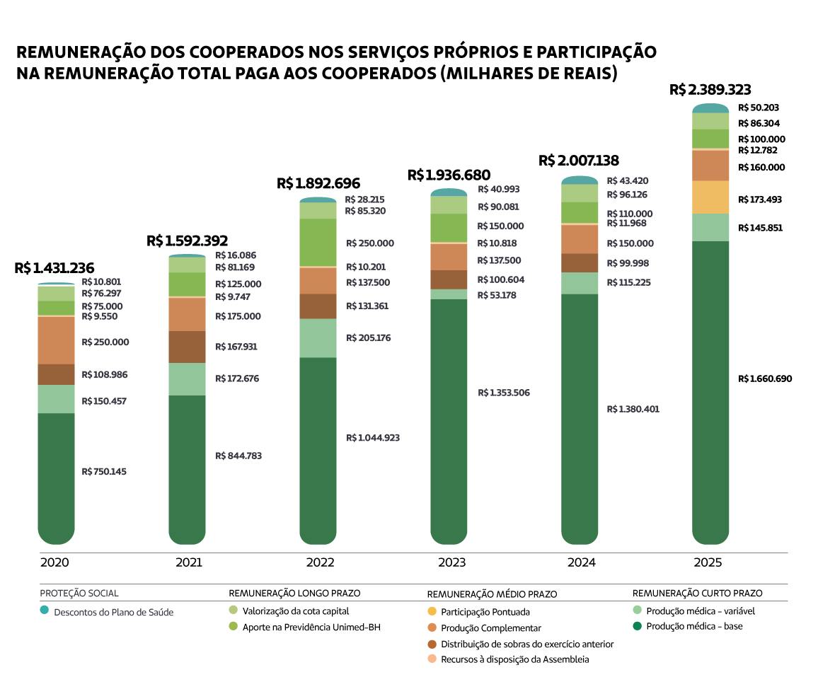 E, graças aos resultados alcançados, temos conseguido cumprir com o nosso compromisso de valorização contínua do trabalho médico. Prova disso foram os investimentos na Jornada do Cooperado, que promovem melhorias em todos os pontos de contato do médico ao longo de sua trajetória na Cooperativa. Outro importante avanço foi a evolução da remuneração médica, com reajuste de honorários e a manutenção da proteção social aos nossos cooperados.