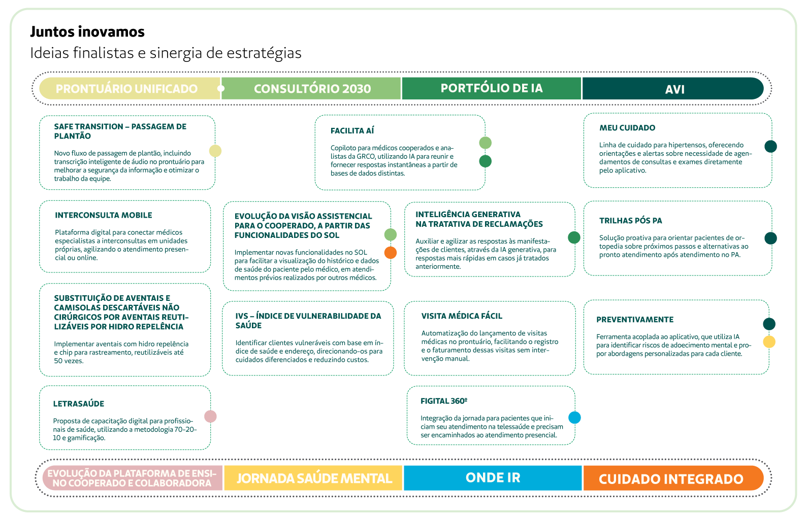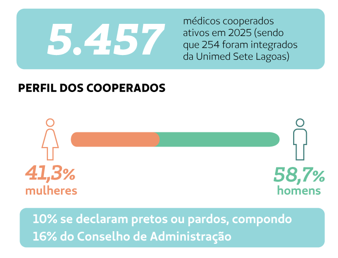 Também seguimos inovando de forma estratégica. O fortalecimento do Horizontes Hub, as iniciativas que integram o Consultório 2030 e a ampliação de iniciativas digitais colocaram a Cooperativa à frente das tendências do setor, permitindo cocriar soluções que transformam a jornada dos médicos cooperados e dos nossos clientes, buscando antecipar suas necessidades. A tecnologia, aliada à humanização, é hoje um pilar essencial para entregar uma assistência mais acessível, resolutiva e centrada no cliente, sempre visando aos resultados para os cooperados e para a Cooperativa.